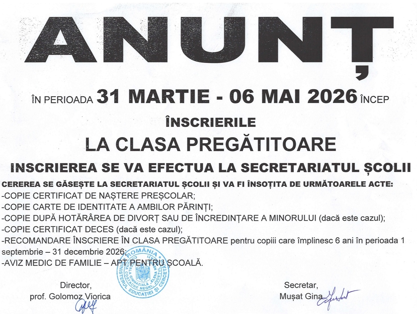 In anul școlar 2022-2023, în planul de școlarizare a fost alocata 1 CLASA PREGATITOARE, fără criterii de departajare generale și specifice.