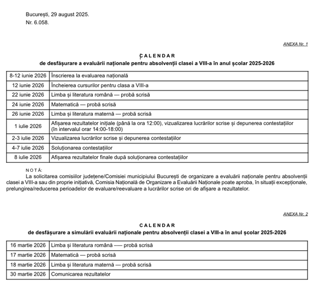 ORDIN privind organizarea și desfășurarea Evaluării Naționale pentru absolvenții clasei a VIII-a în anul școlar 2025-2026