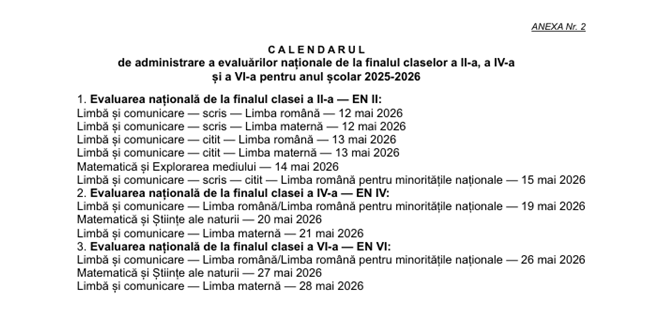 CALENDAR EVALUARE NATIONALA clasa a VIII-a / 2026